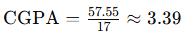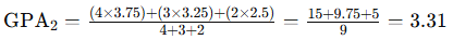 Total weighted points = (3.47 × 8 credits) + (3.31 × 9 credits) = 27.76 + 29.79 = 57.55