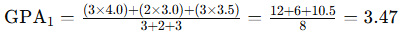 Semester 1: Course A (3 credits, A+ = 4.0), Course B (2 credits, B = 3.0), Course C (3 credits, A− = 3.5)
