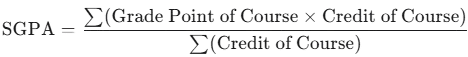 | Course Code | Credit (Ci) | Letter Grade | Grade Point (Gi) | Earned Points (Ci×Gi) |