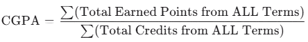 ‘F’ Grade (Fail): Carries a Grade Point of 0.00. These courses are counted in the Σ(Total Credits) denominator in the term they are taken, thus lowering your SGPA/CGPA significantly, but they do not count towards the credits earned for graduation until they are successfully retaken.
