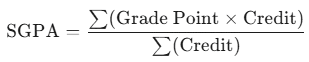 Important: If you receive an F grade in any subject, you fail that semester. The F grade’s point value (0.00) is used in the SGPA calculation, which significantly lowers the result. You must clear all F grades to graduate and before the CGPA can be finalized.